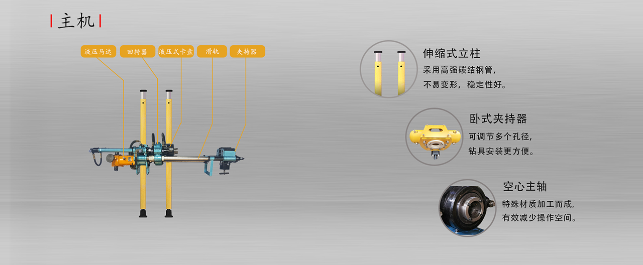 1. 坑道钻机适用于2000X2000mm的顶板完整无破碎,无流沙,无支护的硐室内使用,360度全方位钻进取芯。
