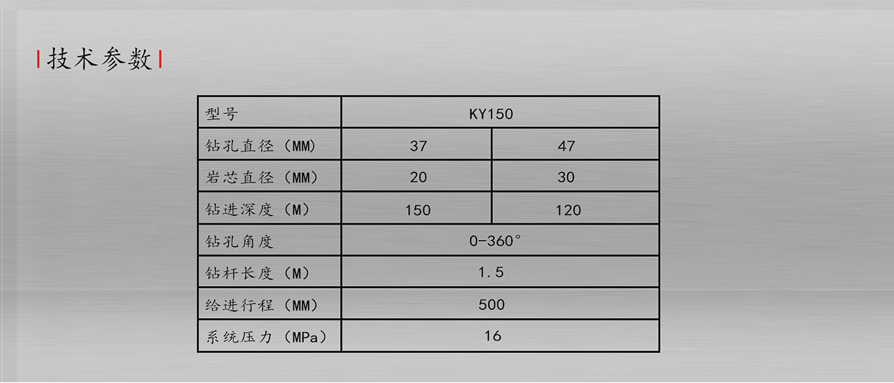 型号说明:ky-150型、k是坑道,y是液压操纵机械传动,150是钻进深度(米)