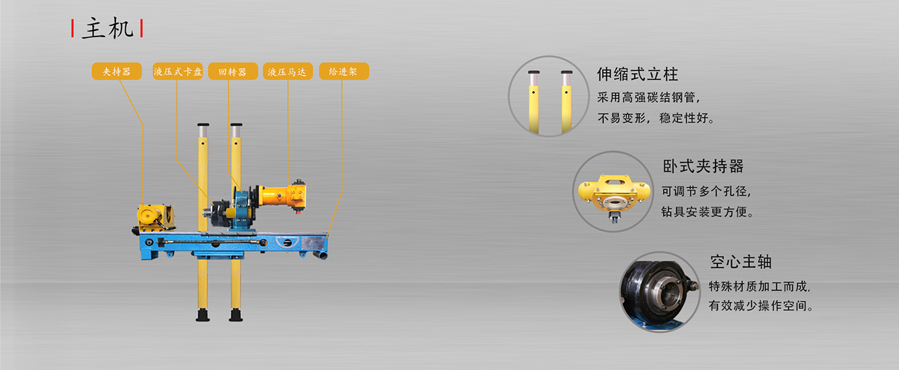 1. 坑道钻机适用于2000X2000mm的顶板完整无破碎,无流沙,无支护的硐室内使用,360度全方位钻进取芯。