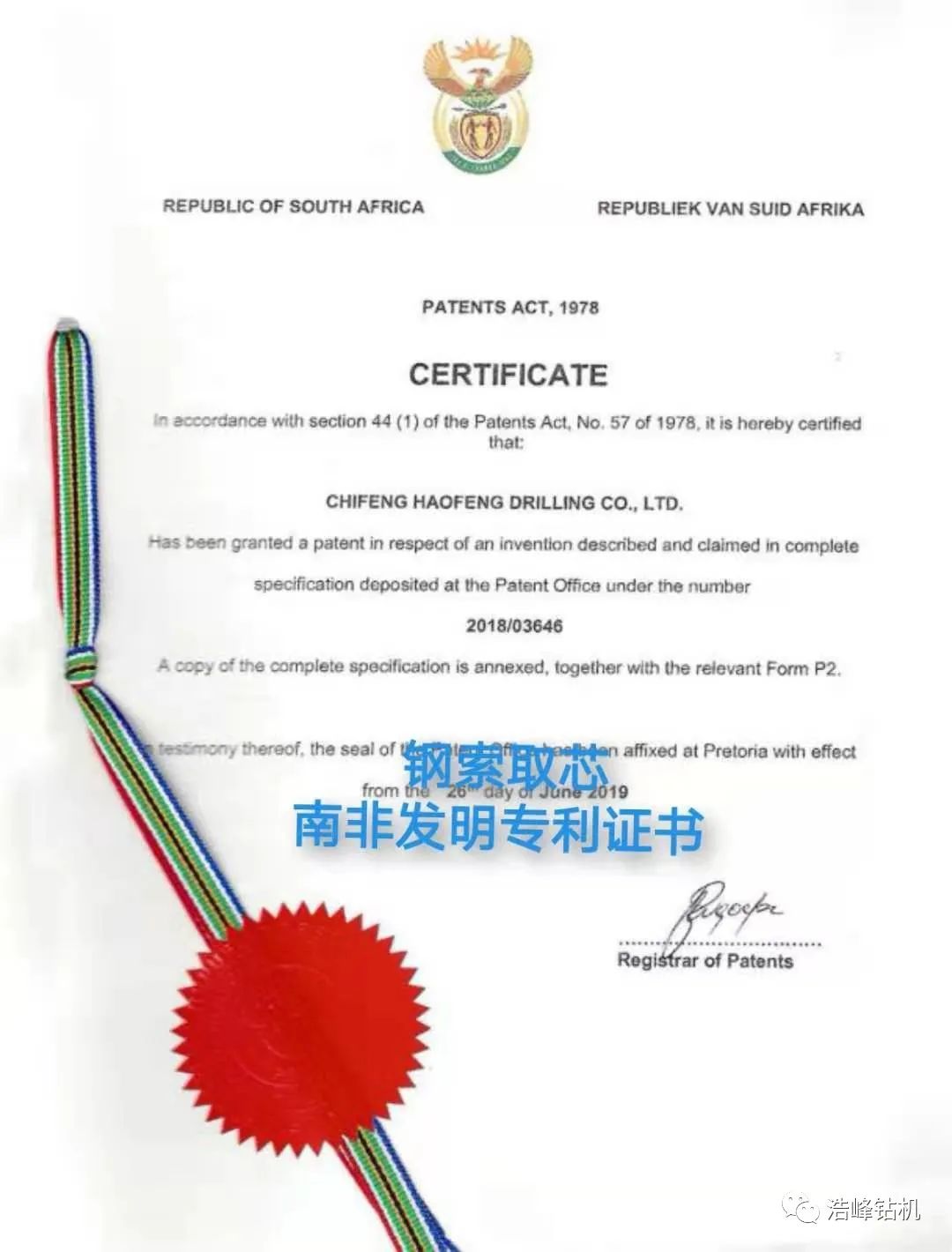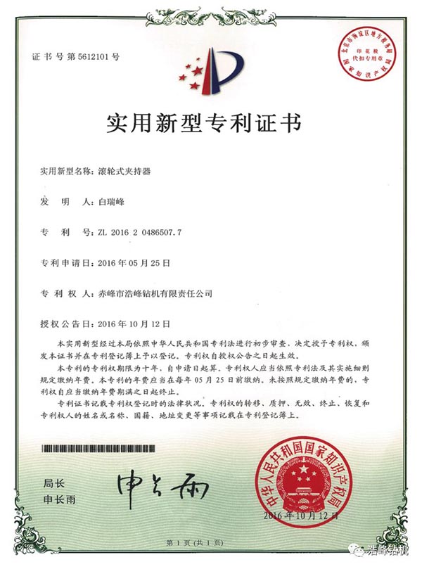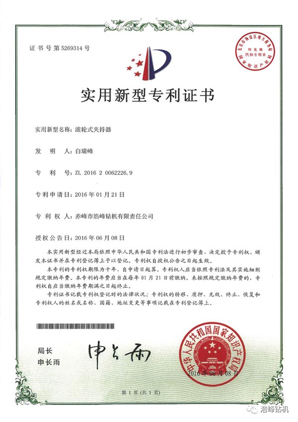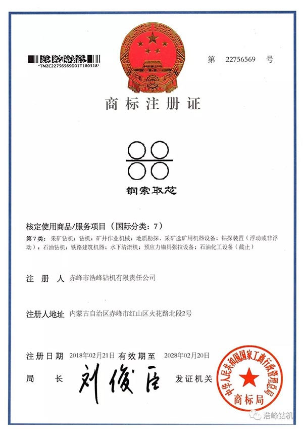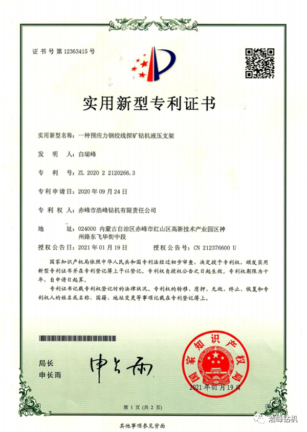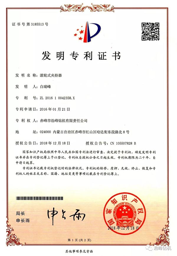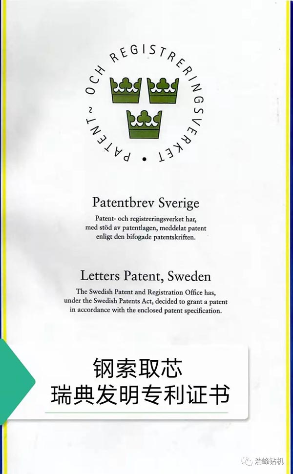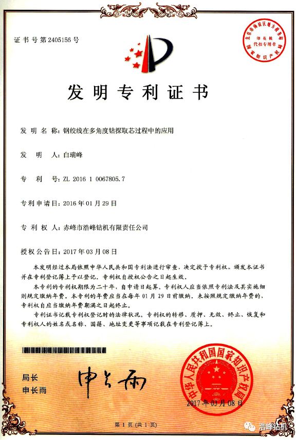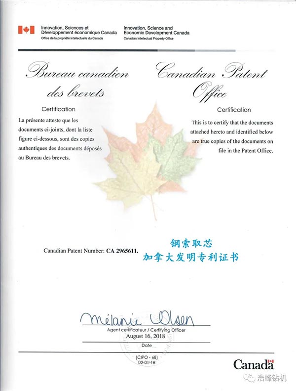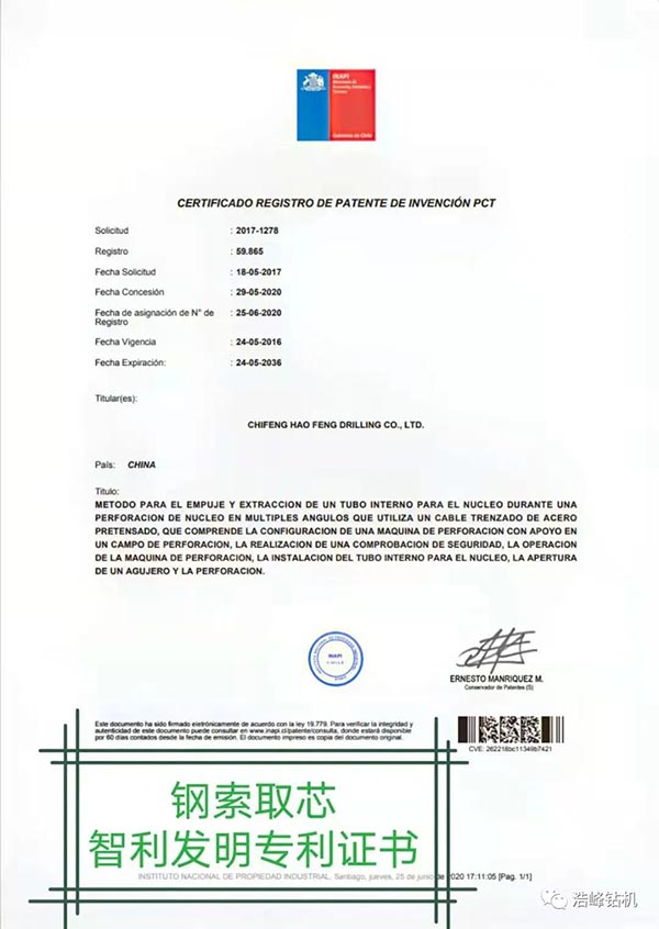 我公司通过多年的努力,自主研发发明专利已授权3项,还在审批中2项,实用新型专利4项,其中一项探矿取芯技术发明专利已申请8个国家PCT国际专利,加拿大/美国/俄罗斯/瑞典/南非/智利/澳大利亚已经授权PCT国际发明专利证书。